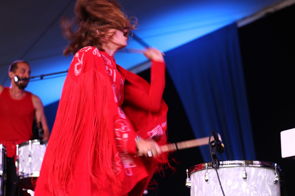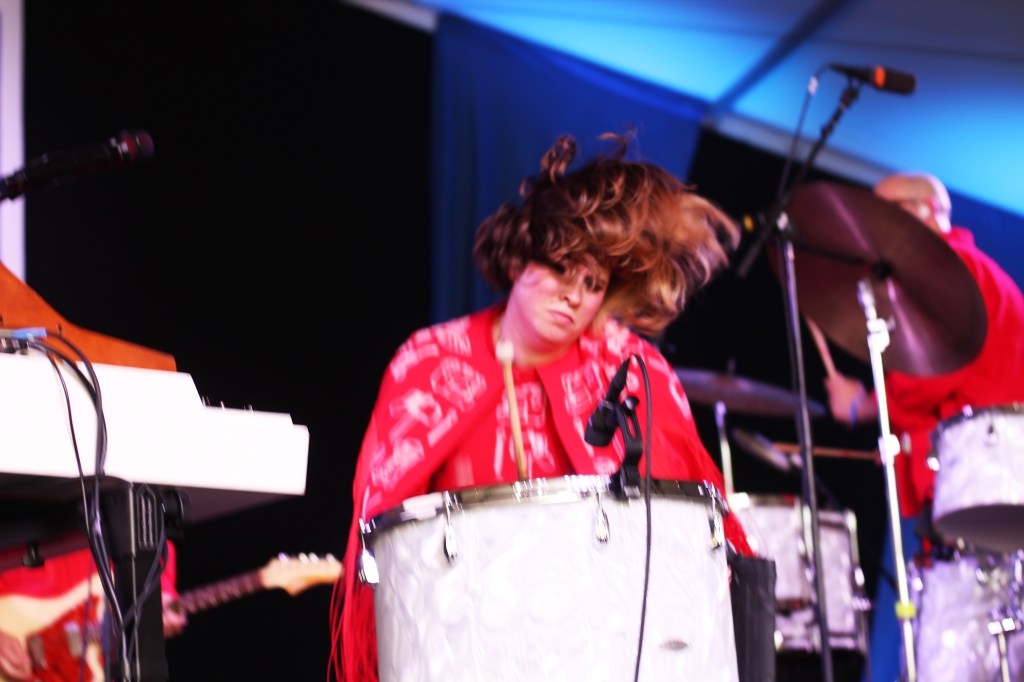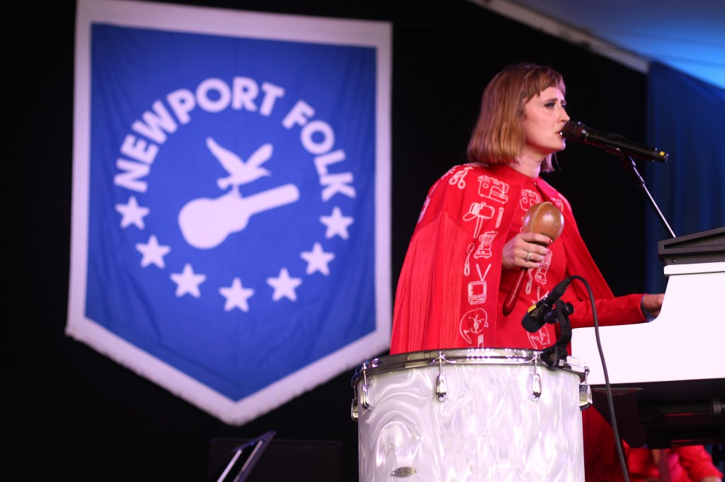 (Photo by Aimsel Ponti)Holly Laessig pounding on a drum at the Newport Folk Festival on July 27, 2025.