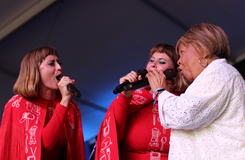 (Photo by Aimsel Ponti)Holly Laessig and Jess Wolfe of Lucius with Mavis Staples at the Newport Folk Festival on July 27, 2025.